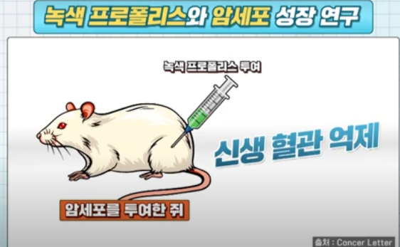 암세포를 투여한 쥐에 녹색 프로폴리스를 투여했을때 신생 혈관 억제를 통해 암세포 성장과 전이 예방에 도움을 준다는 연구결과도 있다. 또한 천식 유발 염증 세포 억제 및 증상, 유발 요인 감소된다. 그린 프로폴리스 속에 들어있는 플라보노이드는 혈관 상처, 세포를 재생시켜 혈관 탄력 회복에도 도움이 된다. 더불어 혈당, 혈압 수치 개선으로 혈액순환, 신진대사를 촉진시킨다.