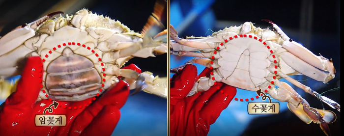 암꽃게와 수꽃게를 구별하는 방법은 배 모양이다. 암꽃게는 배 부분이 둥글고 넓으며, 간장게장에 적합하다. 수꽃게는 배 부분이 뾰족하고 좁으며, 살이 풍부해 찜과 탕 요리에 적합하다. 속살을 좋아한다면 수꽃게를, 내장과 난소를 좋아한다면 암꽃게를 선택하면 된다.
