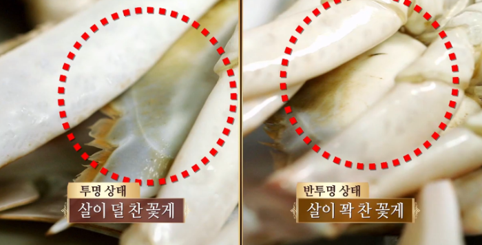 같은 크기의 꽃게 10마리 정도를 들어보자. 무거운 것이 실속 있는 꽃게이다. 수조에서 오래 있던 꽃게는 껍데기만 멀쩡해도 속이 비어 가볍다. 수조에 오래 산 꽃게는 자신의 살을 소모하기 때문에 속이 빈 경우가 많다. 꽃게를 들어봤을때 무거워야 살이 많은 꽃게이다. 같은 크기의 꽃게를 10개 정도 들어봐서 무게를 비교해보고 구입하면 된다. 같은 크기 꽃게라도 어항에서 있던 것은 가볍다. 껍데기 때문에 티가 나지 않기 때문에 들어서 확인해봐야 한다.