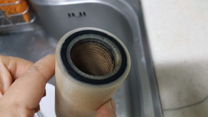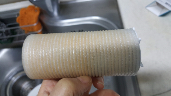 아래는 한달 사용한 필터 색깔이다. 조금 검은색이 윗부분에 감도는 것같기도 하고 아닌것 같기도 하고 왠지 6개월보다 짧게 사용할 것 같은 예감이 든다. 아빠집은 3달 사용하고 교체했다.
