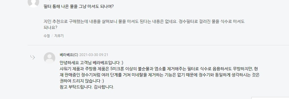 식수로 마셔도 되나요? 문의했더니 이런 답변이 왔다.