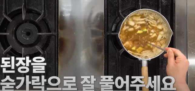 - 냄비에 **물(또는 쌀뜨물) 4컵(750mL)**을 붓고, **된장(1/3컵)**을 풀어 강불에서 끓인다.