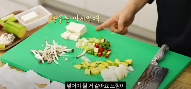 - 양파, 두부는 먹기 좋은 크기로 썰고, 청양고추, 홍고추, 대파는 1cm 두께로 썬다.