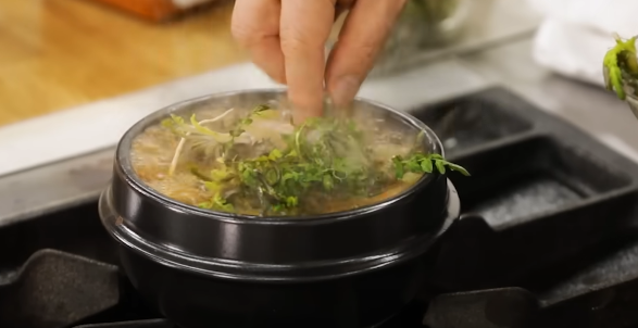 - 냉이가 익기 시작하면 두부, 대파, 청양고추, 홍고추를 넣고 한 번 더 끓인다.