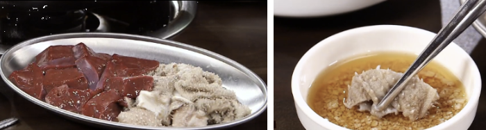 날것으로 간과 함께 내주는 천엽과 간 , 참기름 장에 찍어먹는다.
