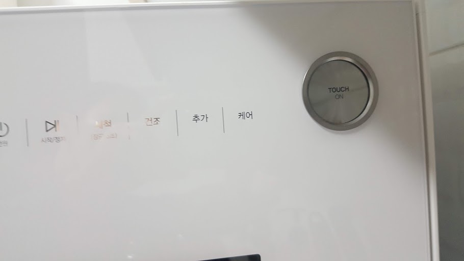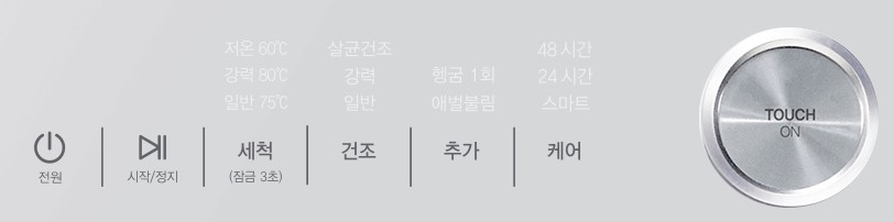 코스는 세척, 건조, 케어 각각 맞춤으로 선택할 수 있어요. Touch on 은색버튼을 2~3초 누르고 있으면 식기세척기 문이 자동으로 열리고 작동이 멈춘 뒤에 밖으로 뜨거운 물이 튀지 않고 안전하게 열립니다.
