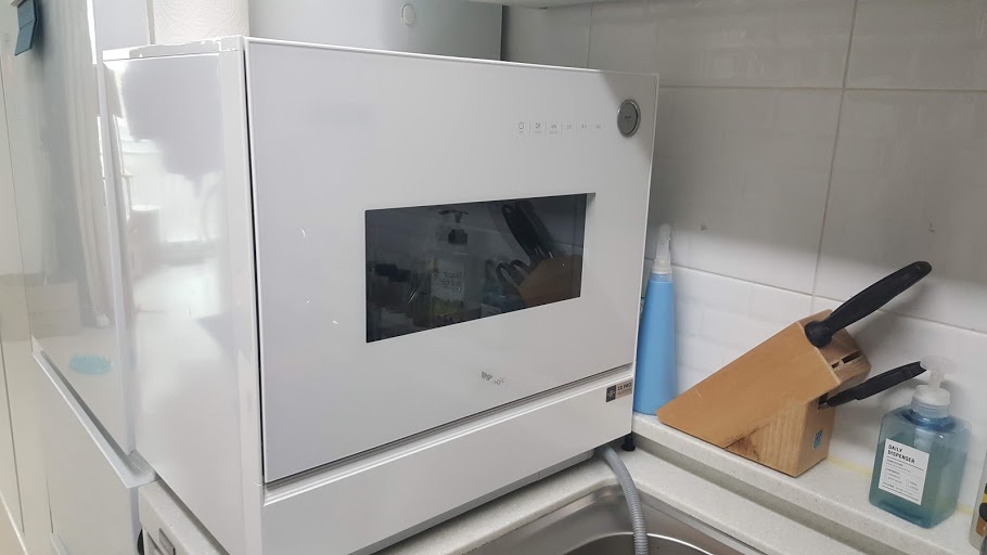 2~3인 식구용인데 생각했던 것보다는 크고 6인용분 접시 세척까지 가능합니다. 2 식구 살림이지만 고기를 좋아하는 일인이 있을 때는 정말 설거지하기가 싫죠. 또한 주방이 크지 않는 가정에서도 설치가 용이한 것이 장점입니다.