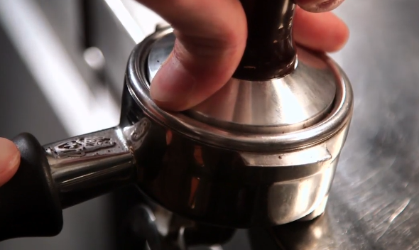 포타필터에 7g의 분쇄된 커피를 넣고 고르게 분배한 후, 탬퍼로 약 15~20kg의 힘으로 평평하게 누른다. 고르게 눌러야 물이 일정하게 통과하며 균형 잡힌 맛을 낼 수 있다.