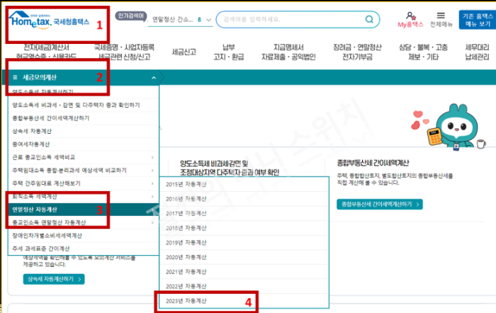 2.'세금모의계산' → '연말정산 자동계산' 메뉴 선택