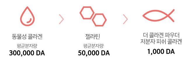 저분자피쉬콜라겐의 달톤 단위는 1000DA로 다른 동물성 콜라겐이나 젤라틴형으로 나온것에 비해 흡수률이 높다는 것을 알수 있어요.