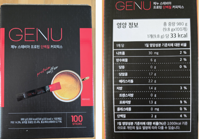 - 쿠팡: 제누 스테비아 프로틴 단백질 커피믹스 9.8g, 100개입