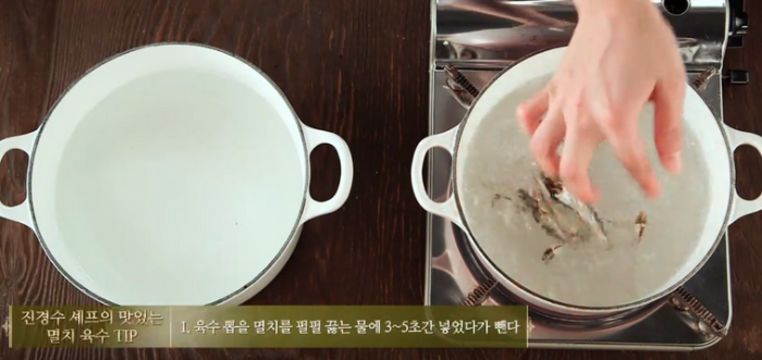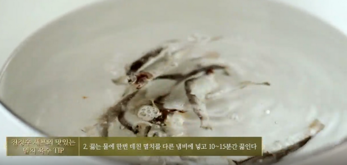 - 멸치를 끓는 물에 한 번 넣었다 빼 비린내와 잡스러운 맛을 제거한다.