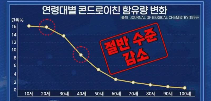 연골 속의 스프링(콘드로이친)도 나이가 들수록 꺼지기 시작한다. 20대 때 연골 내의 콘드로이친 함유량이 최대치가 되고 나이가 들수록 콘드로이친의 양이 감소한다. 40대가 되면 20대의 절반 수준으로 감소한다.  70대가 되면 거의 소멸한다.