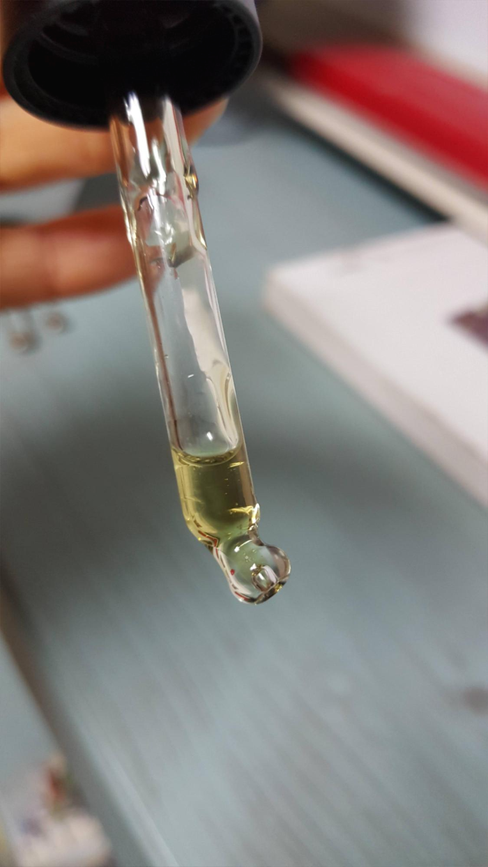 이렇게 색을 비교해 보면 트리앤씨 오일이 조금 더 녹색을 띄고 있고 아우라카시아 오일은 노란빛이 좀더 강하다. 진짜 기름같다.