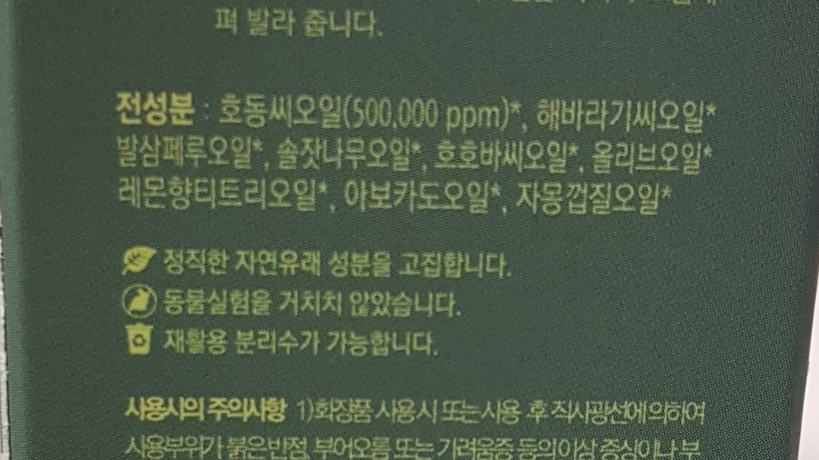 위에 보는 것처럼 호동씨 오일이 타마누 오일이고 그 이외에 해바라기씨, 잣나무, 호호바씨오일, 레몬향 티트리오일, 자몽껍질 오일등 아주 다양한 오일이 들어갔다. 레몬향과 자몽껍질 오일 덕분에 향기는 아우라카오일에 비해 상당히 상큼하다. 기미 검버섯이 드라마틱하게 효과를 볼 만큼의 성분과 양이 별로 없다.