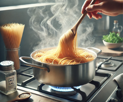 1. 큰 냄비에 물을 듬뿍 넣고 100g당 약 1리터 정도의 물을 끓인다. 물이 팔팔 끓으면 소금을 넣는데, 물 1리터당 약 10g 정도 넣으면 좋다. 간단히 말해 바닷물처럼 짭짤한 정도를 권장한다. 그 다음 스파게티 면을 넣고, 서로 달라붙지 않도록 살살 저어준다.