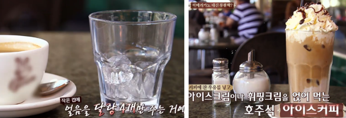 또한 호주에는 아이스아메리카노가 없다. 유럽에선 커피를 차갑게 먹는 거에 대한 개념이 없다. 아이스아메리카노 달라고하면 달랑 얼음 4개들은 컵에 얼음을 담아준다. 호주식 아이스커피는 아이스크림이나 휘핑크림을 얹어 먹는 것