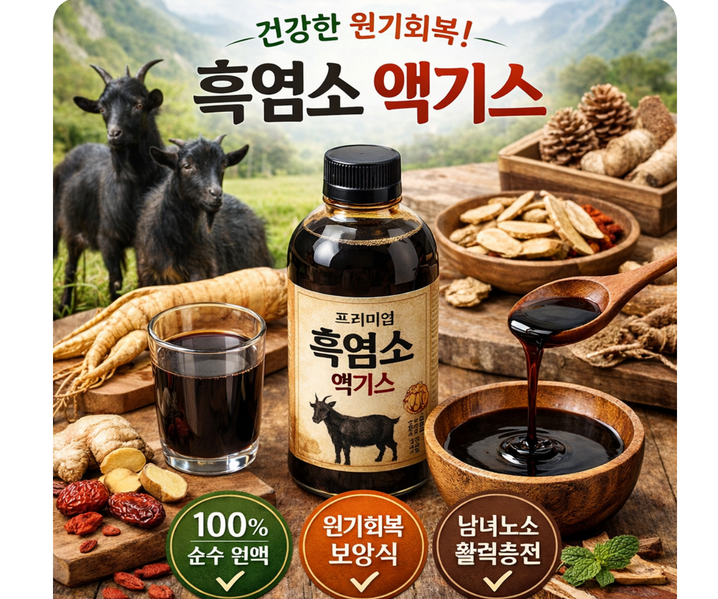 흑염소 액기스(Black Goat Extract)는 한국에서 전통적으로 기력 회복과 보양을 위해 즐겨 찾는 건강 보조 식품입니다. 특히 여성 건강과 면역력 증진에 효과가 있는 것으로 알려져 있습니다. 흑염소