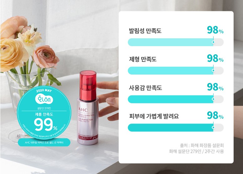 퍼센티지는 모르겠고 사용해본 결과 나의 점수는 80% 정도는 만족감이 있습니다. 가볍고 촉촉하게 발려서 화장할 때 들뜸이 없는 것도 좋고 마스크를 사용하는 요즘은 화장도 거의 안 하는데 피부도 편안하고 보습도 나쁘지 않게 유지되는 것도 좋은 거 같아요.